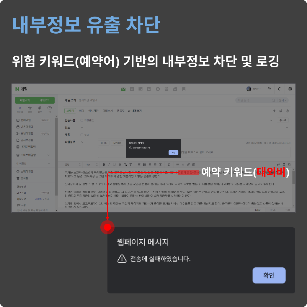조건별(사용자/발신자/서비스/예약어/첨부파일/URL TOP10) 통계 및 리포트 제공