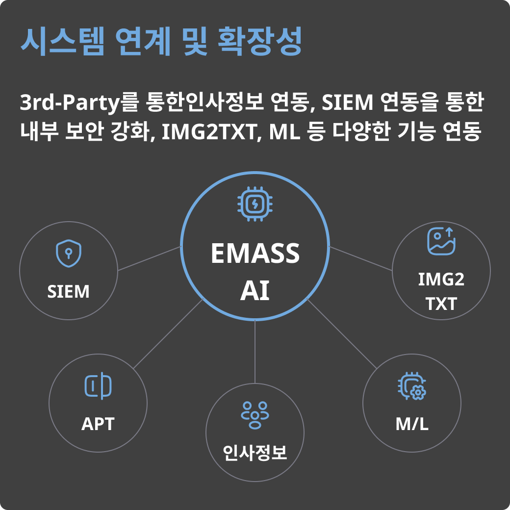 Venus/EMASS AI는 대용량 데이터 처리 성능과 안정성을 바탕으로 기업의 정보 자산을 내부 위협으로부터 보호하는 솔루션입니다. 네트워크 상의 모든 데이터를 수집 및 저장하여 시간당 8만 건 이상의 로깅 처리 성능으로 급증하는 트래픽에도 안정적인 모니터링을 보장합니다. 데이터 분석 및 통계 기능으로 내부정보 유출 위험에 대한 인사이트를 제공합니다.